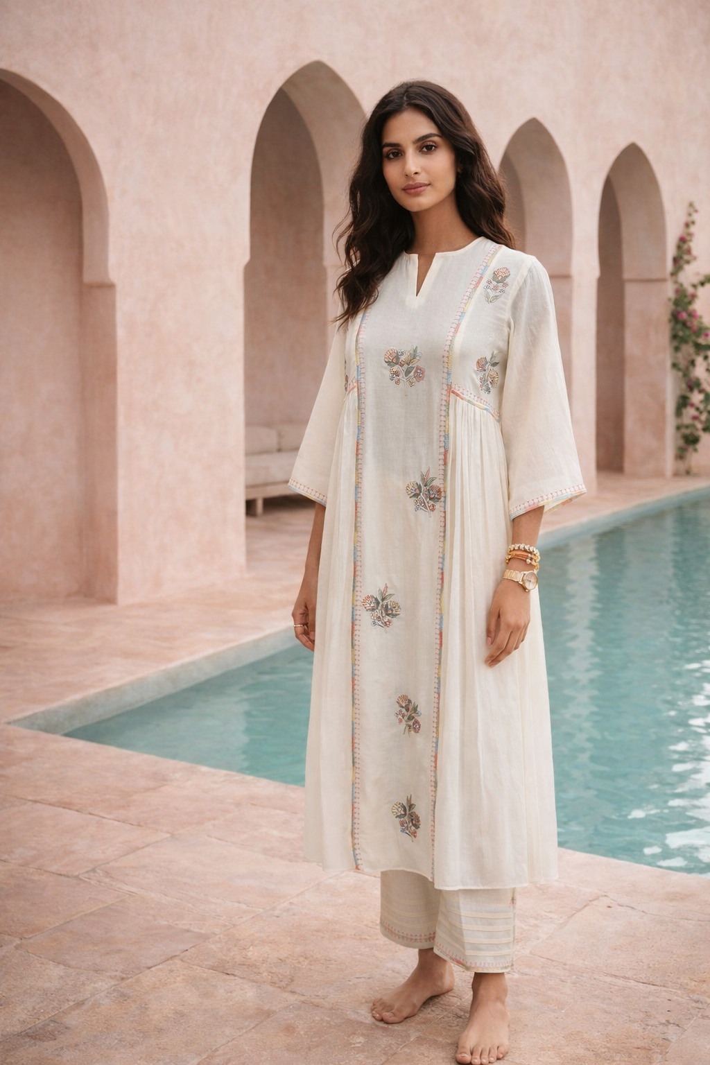 An ode to effortless elegance, this kurta set is crafted in airy mul mul, prized for its soft, breathable feel. The kurta features delicate embroidery placed thoughtfully across the body, enhanced with subtle detailing that adds depth without excess. Its flowing silhouette offers ease and movement, making it ideal for warm days and refined occasions alike. The ensemble is paired with coordinated pants and completed with a scalloped mul mul dupatta, finished with charming tassels that lend a gentle, handcrafted finish. Light, graceful, and timeless, this set embodies understated luxury with a focus on comfort and craftsmanship.