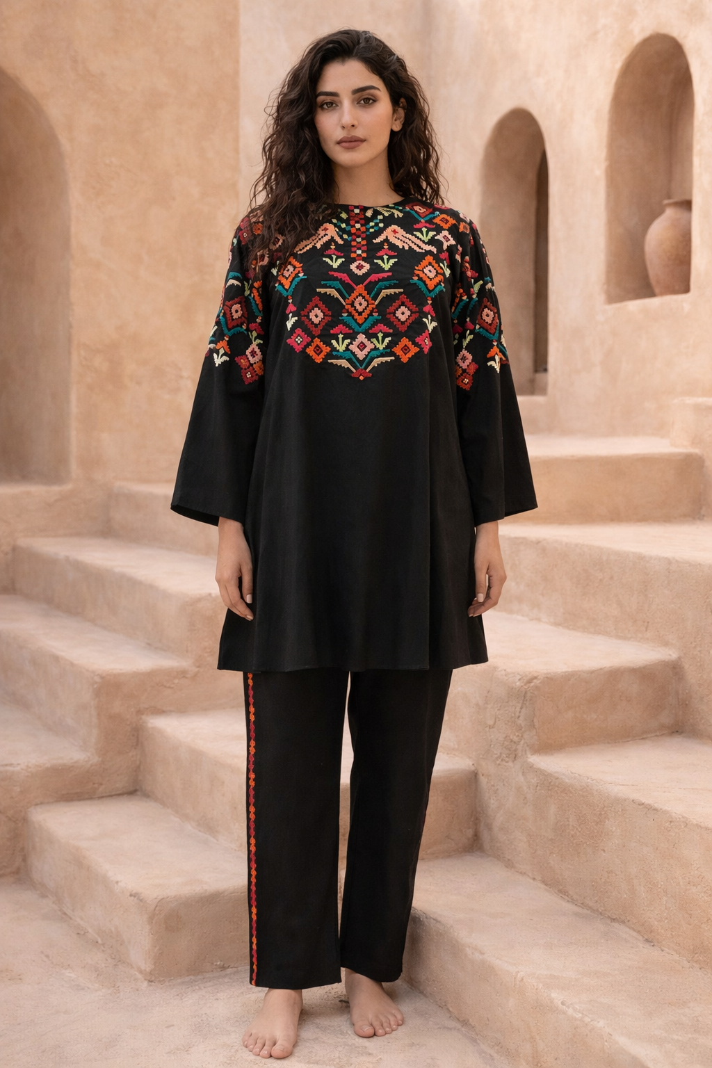 Crafted in crisp cotton poplin, this kurta set brings together comfort and statement detailing. The kurta is adorned with striking geometric and folk-inspired motifs, rendered in vibrant multi-colour thread embroidery across the yoke and sleeves. The clean, structured fall of the poplin fabric balances the richness of the embroidery, creating a look that feels both contemporary and artisanal.The relaxed silhouette offers ease of movement, while the coordinated straight pants—finished with subtle embroidered detailing—complete the ensemble with a refined touch. Designed for day-to-evening wear, this set is ideal for modern festive dressing and elevated everyday occasions.