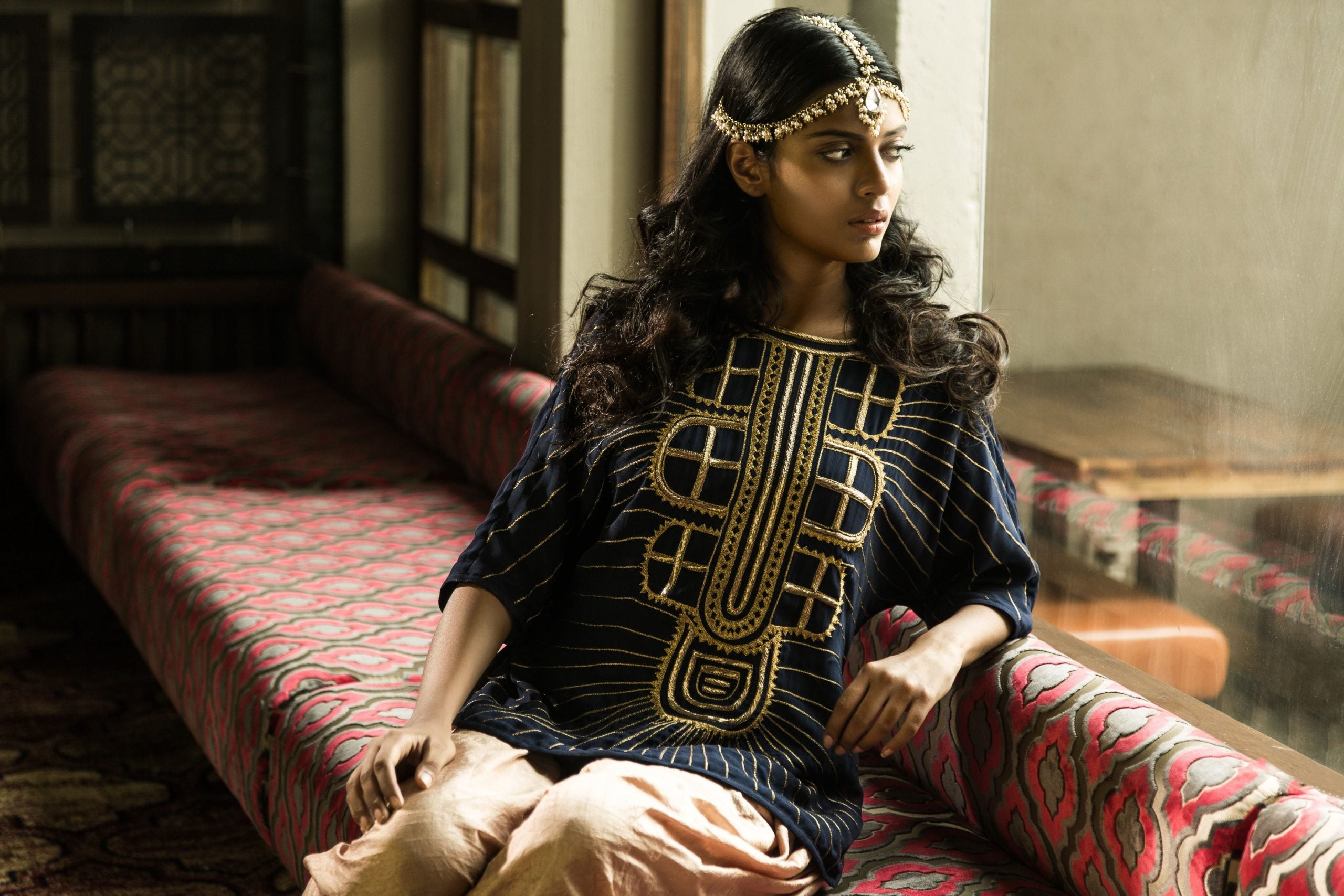 Short Embroidered Kurti Paired With Gold Silk Dhoti Pants.