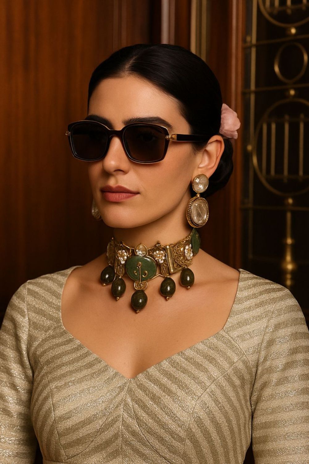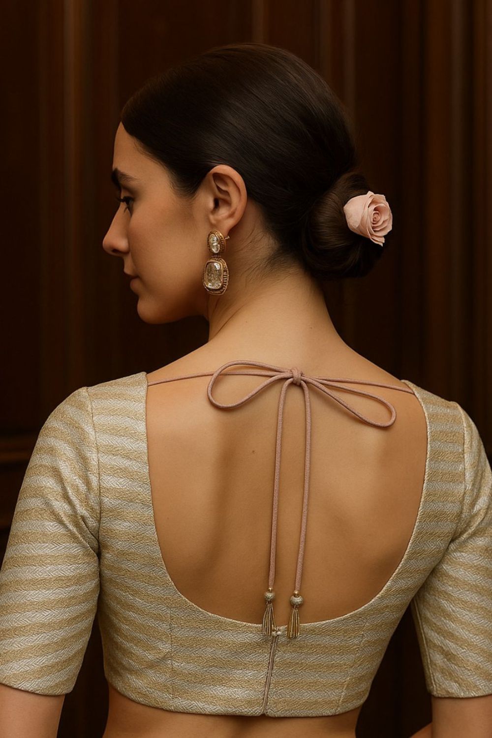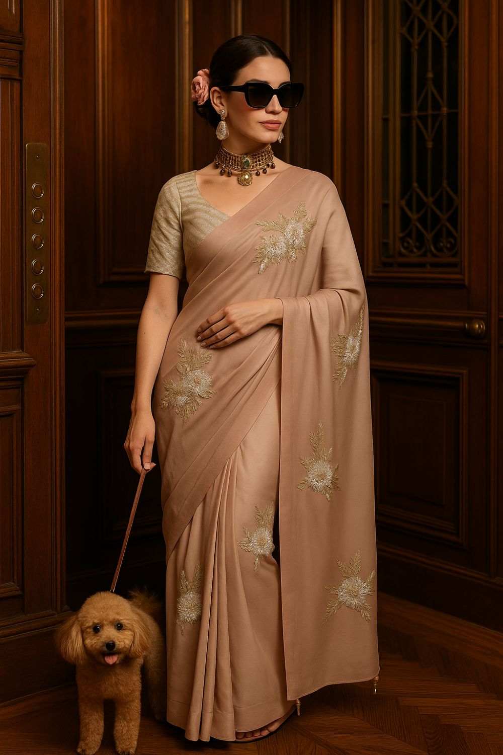 This elegant saree is crafted in luxurious georgette satin, offering a graceful drape and a subtle sheen. It is beautifully adorned with intricate gota embroidery, adding a touch of traditional charm and festive shimmer. Perfect for special occasions, this ensemble blends timeless craftsmanship with effortless sophistication.